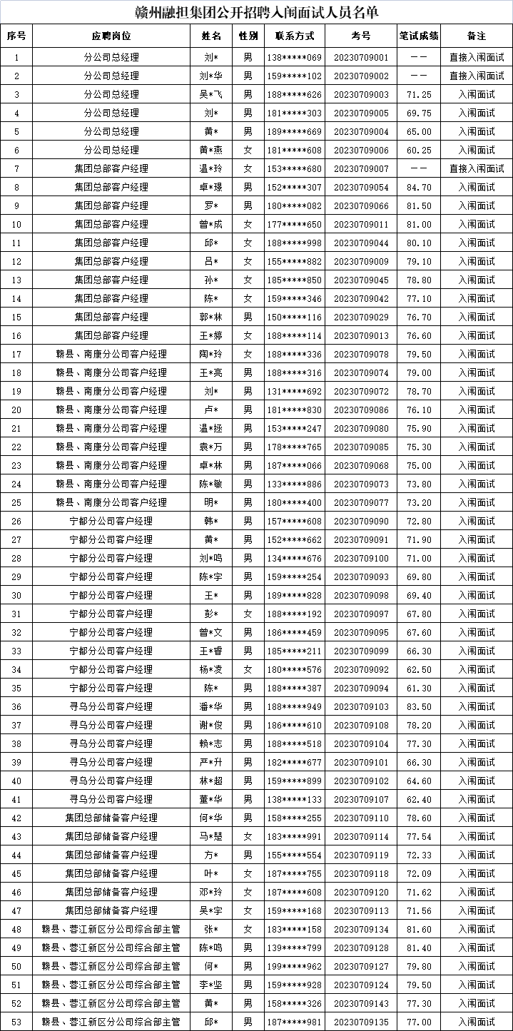 根據(jù)集團(tuán)公司招聘公告的相關(guān)規(guī)定和程序,經(jīng)過(guò)報(bào)名、資格審查、筆試等工作,現(xiàn)將本次招聘入闈面試人員名單(未達(dá)到面試條件的不另行通知)及有關(guān)事項(xiàng)公告如下: 一、入闈面試人員名單 入闈面試人員名單公示期為2023年7月13日至2023年7月14日,公示期間如有異議,請(qǐng)于2023年7月14日17:00前向贛州市融資擔(dān)保集團(tuán)有限公司黨群工作部(人力資源部)口頭或書(shū)面反映,聯(lián)系方式:郵箱jsydbrsb@163.com,0797-8198816。 二、面試時(shí)間及地點(diǎn) 1.面試時(shí)間:2023年7月15日(星期六)至7月16日(星期日),具體面試時(shí)間及事項(xiàng)將電話(huà)通知,請(qǐng)入闈人員保持通訊暢通。 2.面試地點(diǎn):贛州市章貢區(qū)興國(guó)路18號(hào)財(cái)智廣場(chǎng)A座2樓贛州市融資擔(dān)保集團(tuán)有限公司。